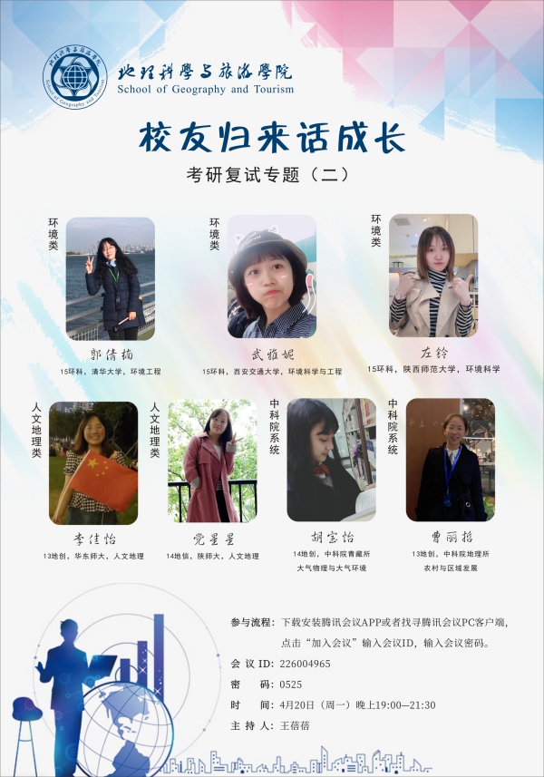 为做好2020年毕业生考研复试工作,帮助地科学子顺利通过考研复试,4月20日晚,365英国上市官网在线举行“校友归来话成长”校友考研经验就业云讲堂第二场举行。本期交流会的嘉宾来自365官网2013级地理科学创新班李佳怡(就读于华东师范大学)、14级地理信息科学党星星(就读于陕师大)、2013级地理科学创新班曹丽哲(就读于中科院地理所)、2014级地理科学创新班胡宝怡(就读于中科院青藏所)、2015级环境科学郭倩楠(就读于清华大学)、2015级环境科学武雅妮(就读于西安交通大学)、2015级环境科学左铃(就读于陕师大)等7位优秀校友在线分享。学院党委副书记郝高建、团委书记王蓓蓓、辅导员张钰超及学院考研、复试的100余名同学参加了交流会。会议由团委书记王蓓蓓主持。